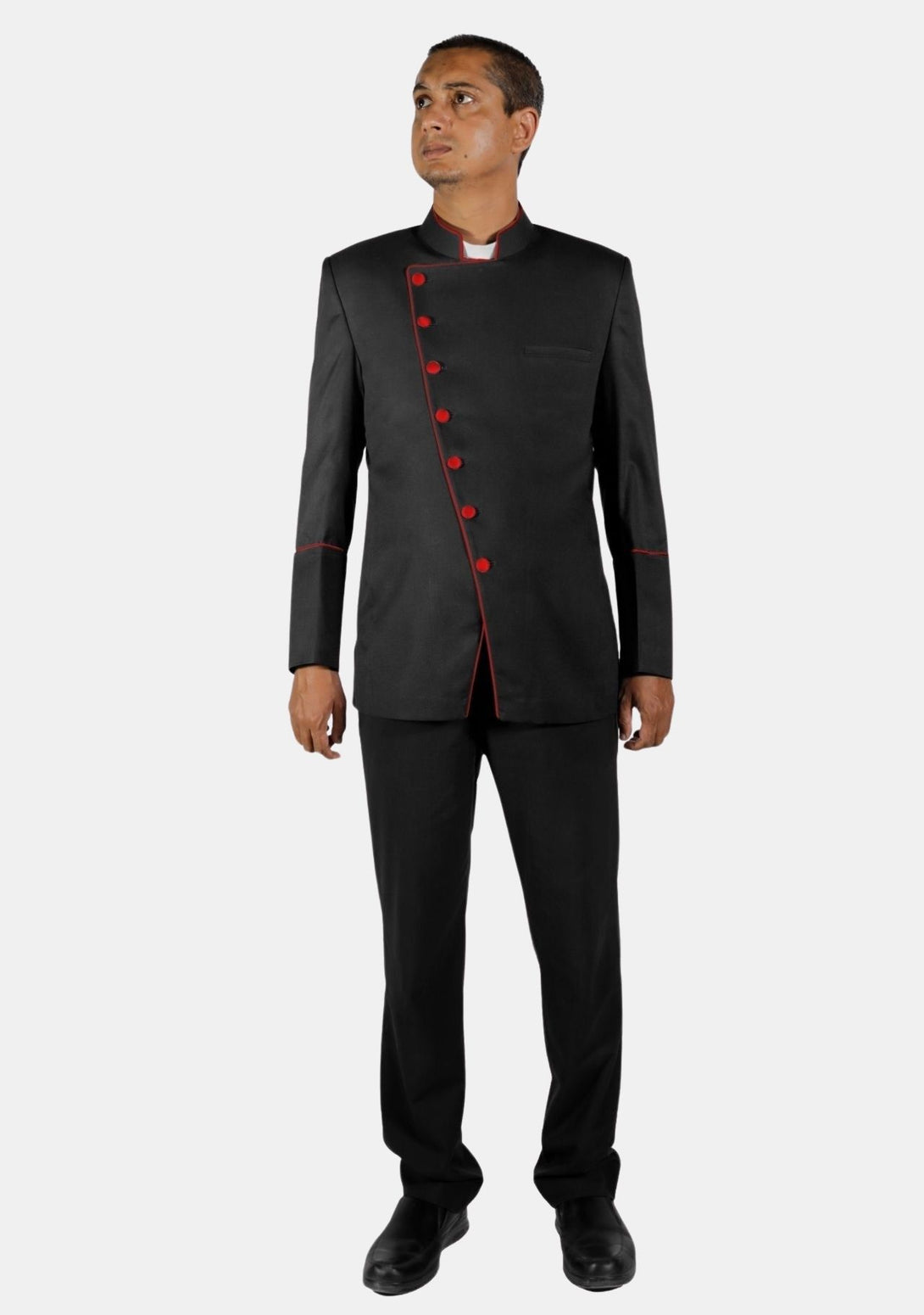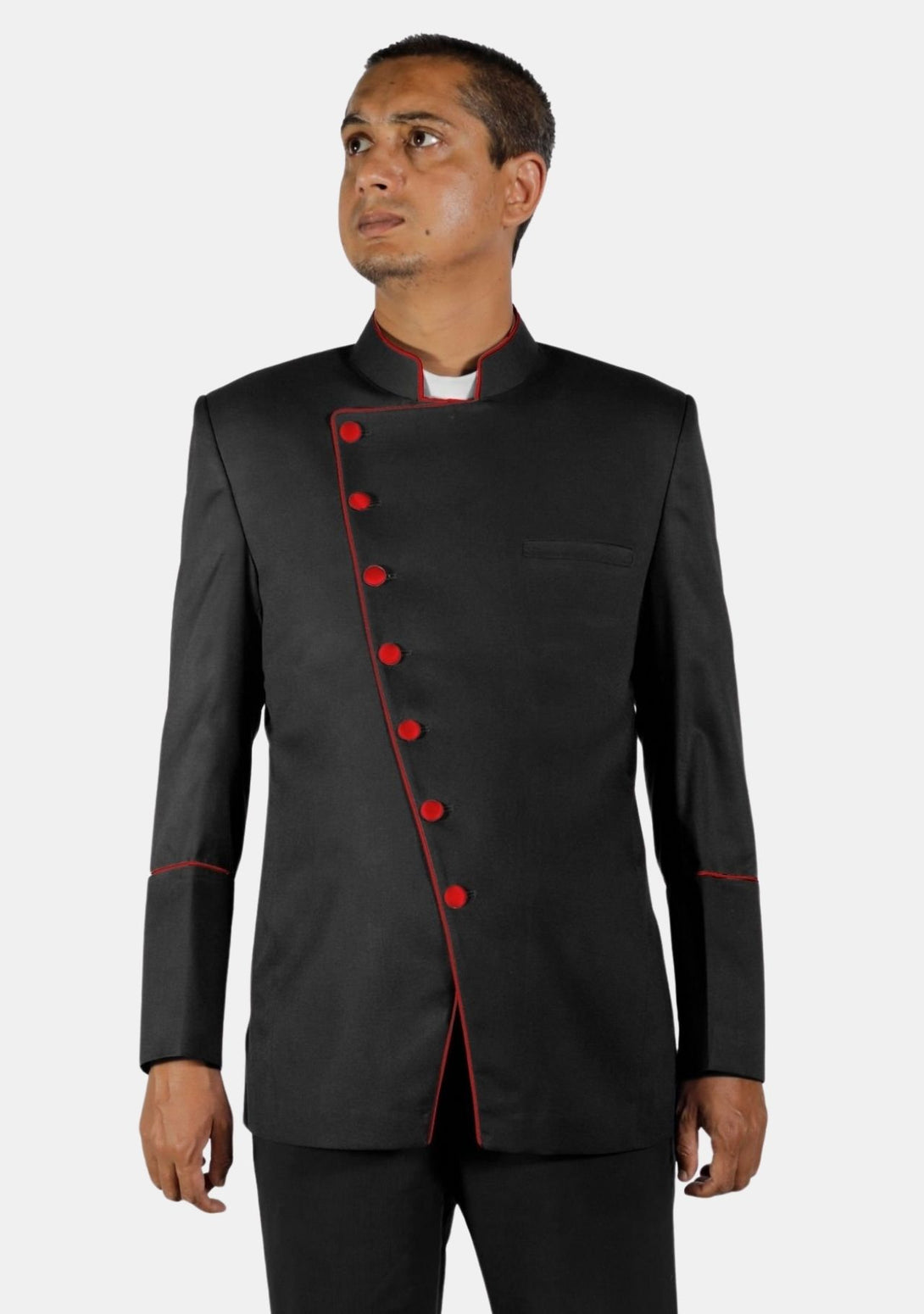 Nous vous proposons notre veste de prêtre noire et rouge, confectionnée avec soin, à la fois élégante et confortable. Dotée d'un style croisé, elle convient à divers événements.