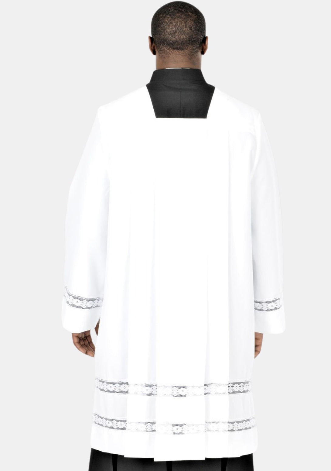 - Orné d'une belle bordure en dentelle sur les manches et l'ourlet, ce surplis ajoute une touche d'élégance et de sophistication, rehaussant l'attrait visuel pendant les services.