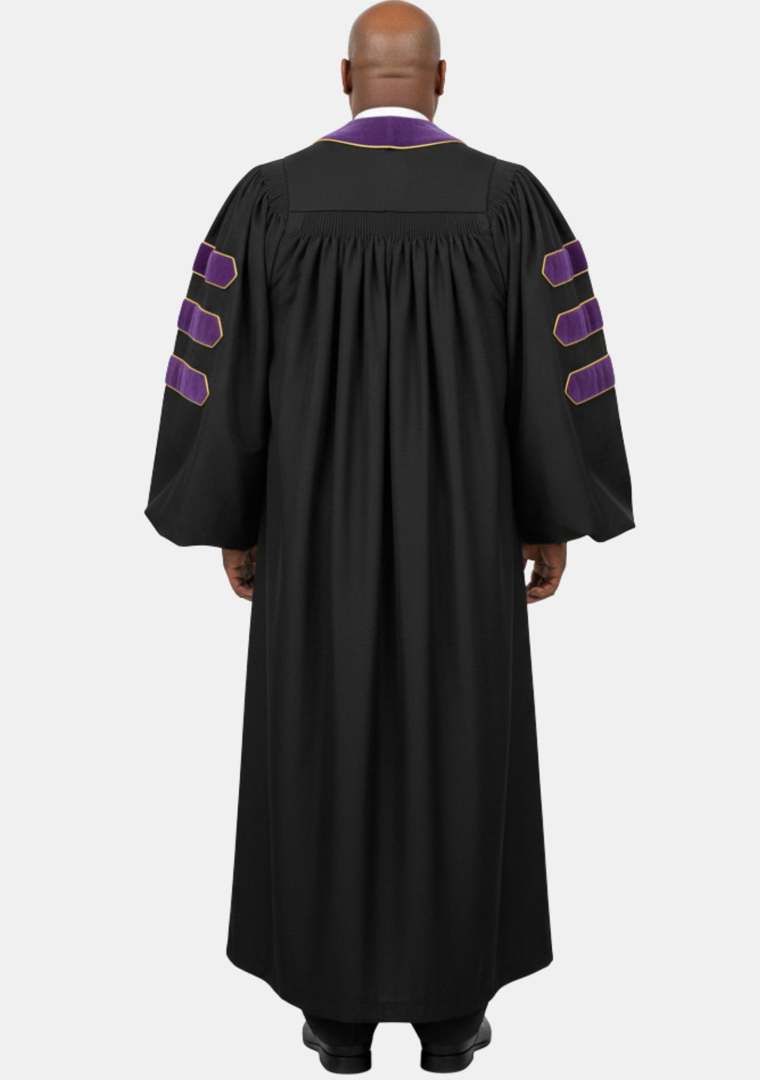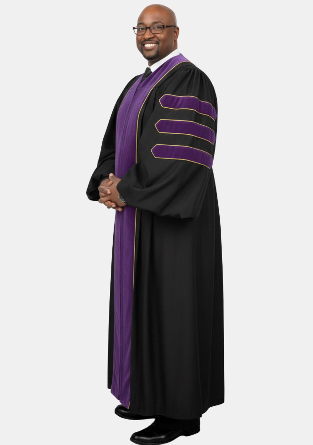 • Velvet Doctoral Bars on Sleeves: Each sleeve carries three Roman-purple velvet doctoral bars, highlighted with contrast gold trim—symbolizing honor, leadership, and your dedication to teaching and shepherding God’s people.