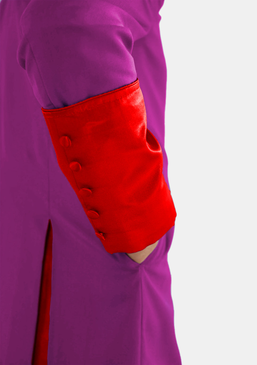 - Red satin cuffs enhance the overall look.