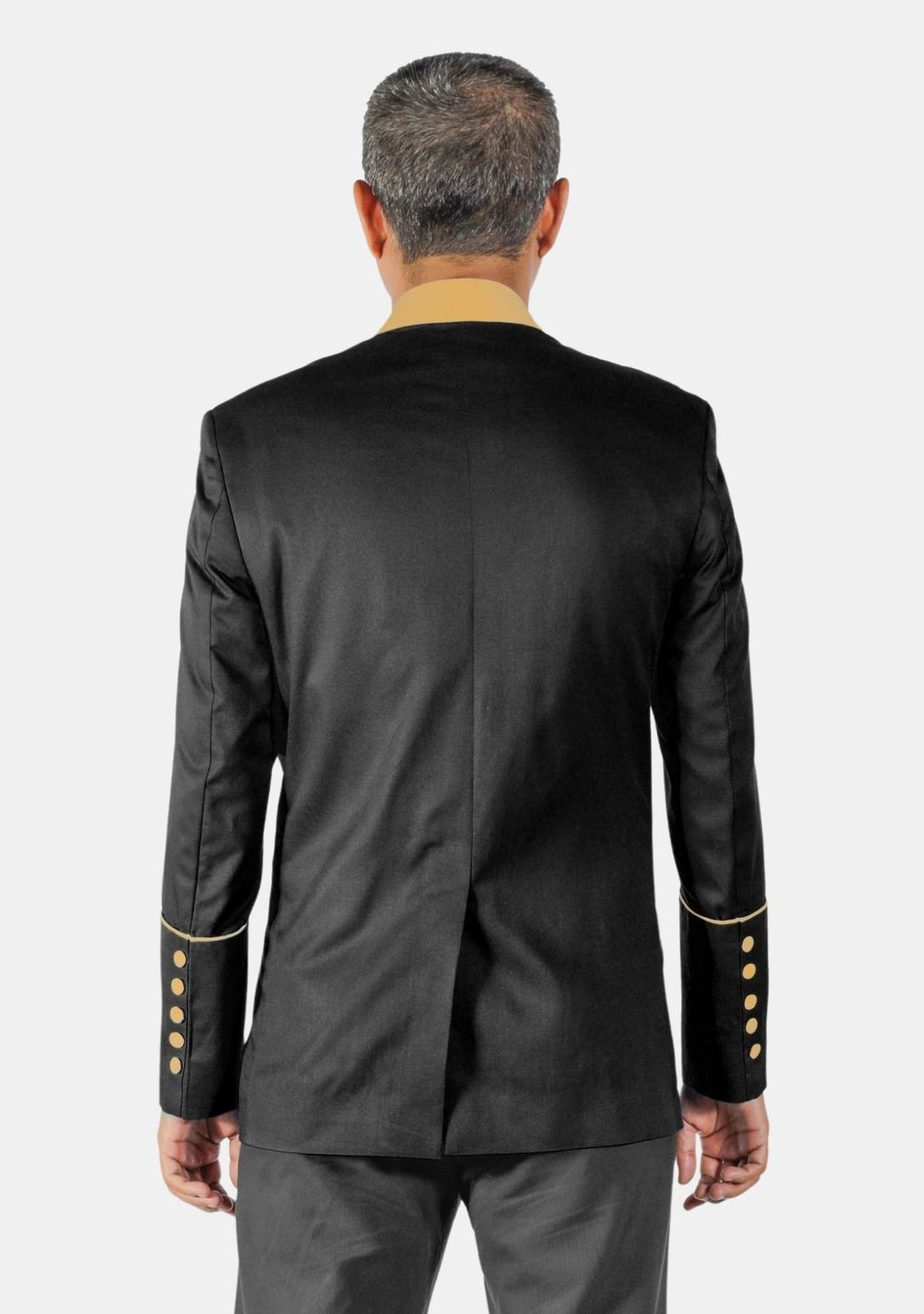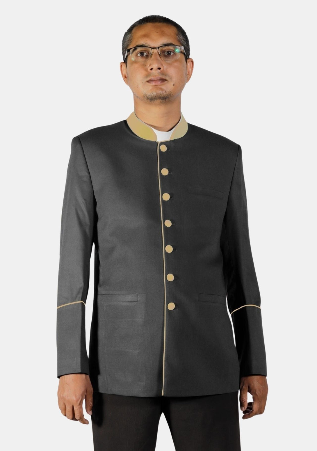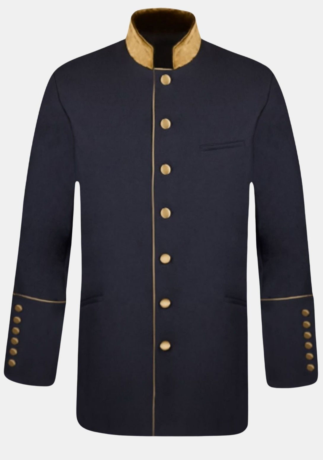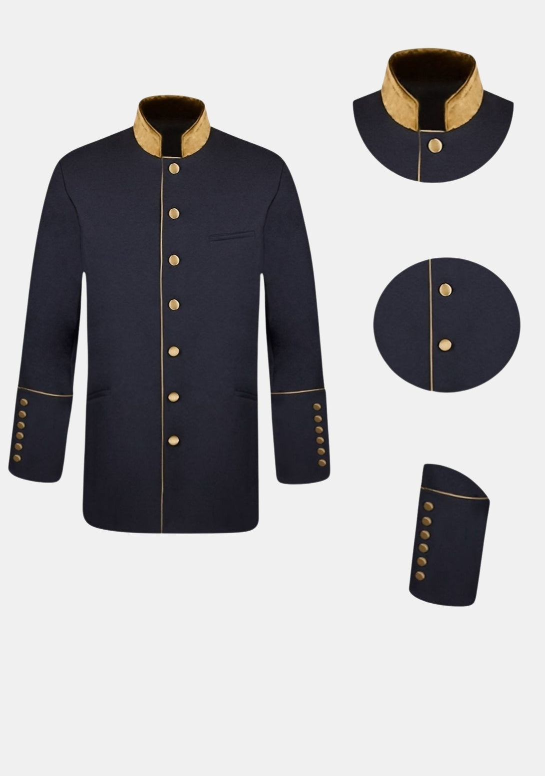 - Golden Piping around the Front Placket and Cuffs.