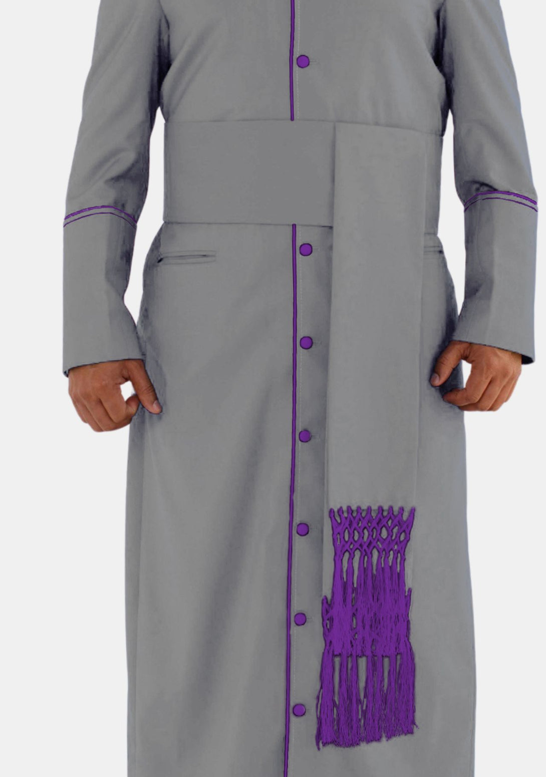 La ceinture grise à franges violettes romaines allie un design classique à une touche de modernité. Son ton gris doux et ses franges d'un blanc éclatant lui confèrent une sophistication subtile, tandis que sa fermeture Velcro réglable et sa taille polyvalente la rendent parfaitement adaptée aux besoins du clergé d'aujourd'hui.