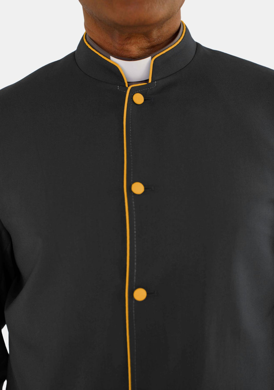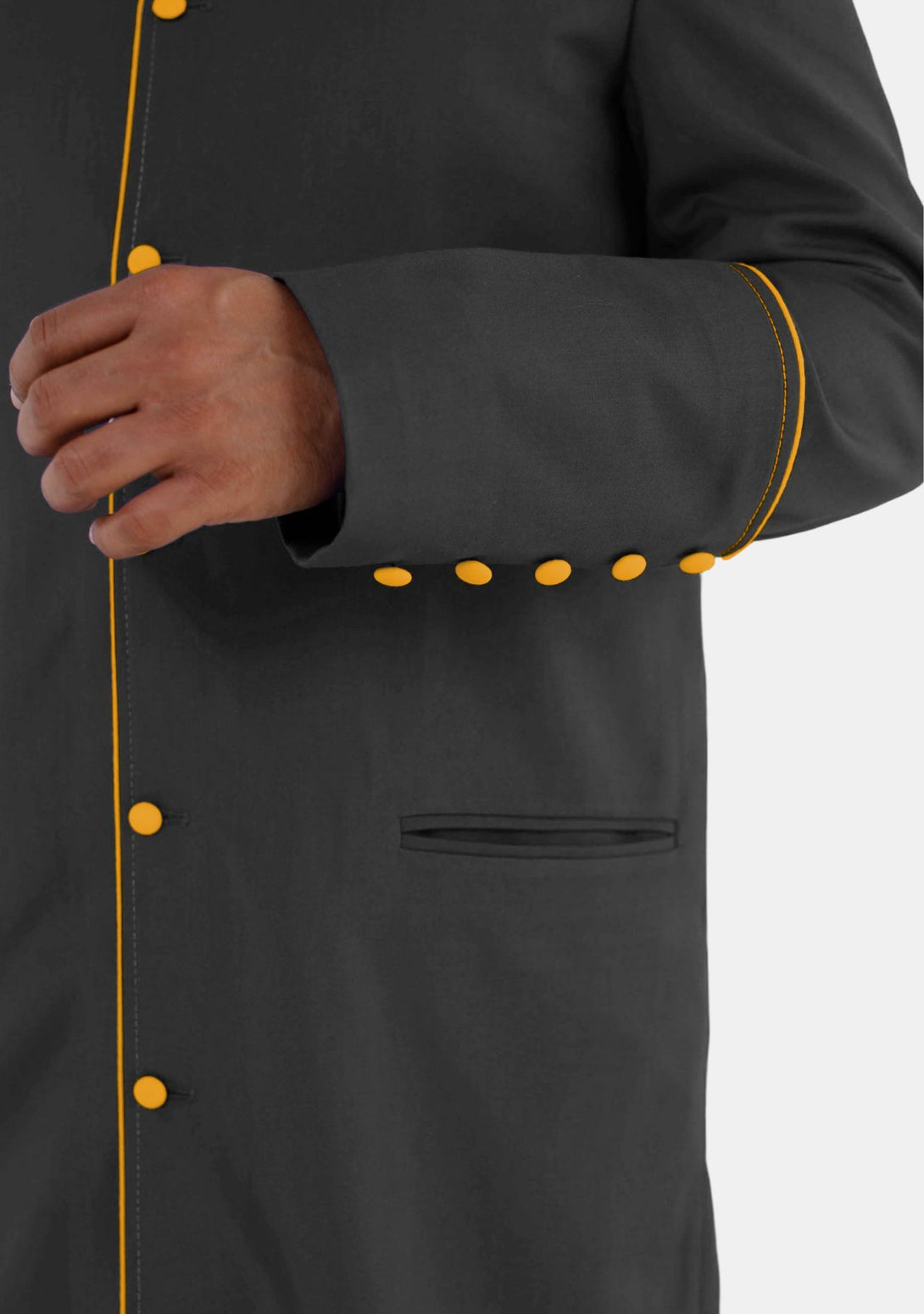 - Gold piping on the collar and cuffs adds elegance.