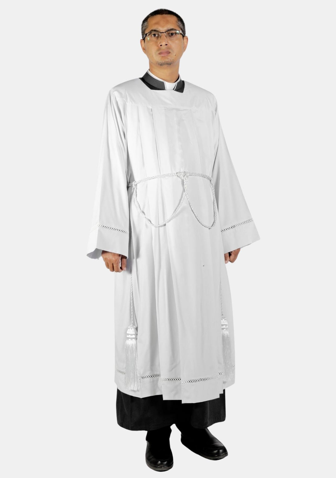 - Options de taille : Cette aube est disponible en cinq tailles, s'adaptant à une gamme de types de corps et assurant un ajustement précis pour les personnes recherchant confort et style dans leur tenue liturgique.