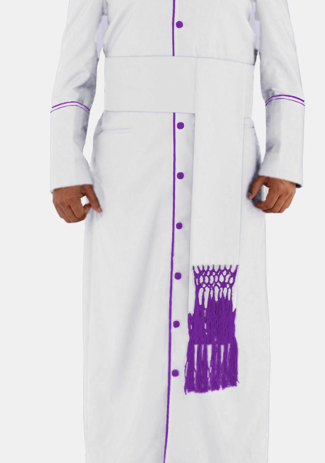 Le port d'une ceinture blanche rappelle la foi, la pureté et le dévouement à l'œuvre de Dieu. Il reflète l'engagement à servir avec humilité et grâce, tandis que les franges violettes romaines symbolisent la sagesse et la responsabilité du leadership.