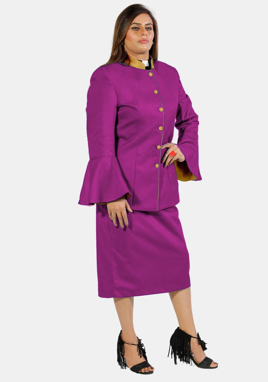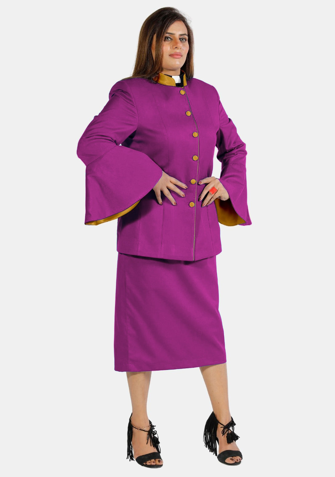 Commandez aujourd'hui pour améliorer votre tenue avec notre costume de clergé pour femme à manches évasées – Rouge Violet/Or !