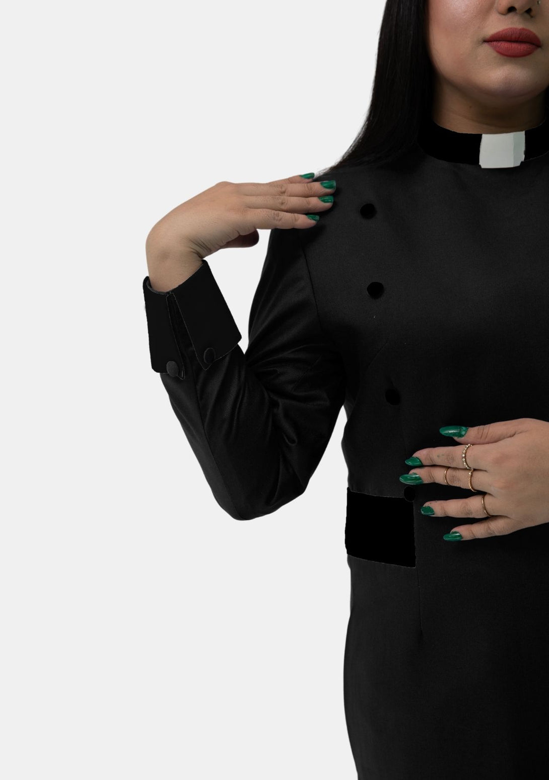 Robe de prêtre noire pour femme avec boutons de créateur : tradition et style